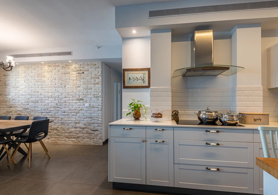 מאחורי שולחן האוכל בולט קיר בריקים ("הדבר האמיתי, לא טפט", ממהרת שטיינר להבהיר. "או ששמים את הדבר האמיתי - או שלא שמים בכלל"). הבריקים חוזרים על עצמם בנגיעות קלות גם במטבח.