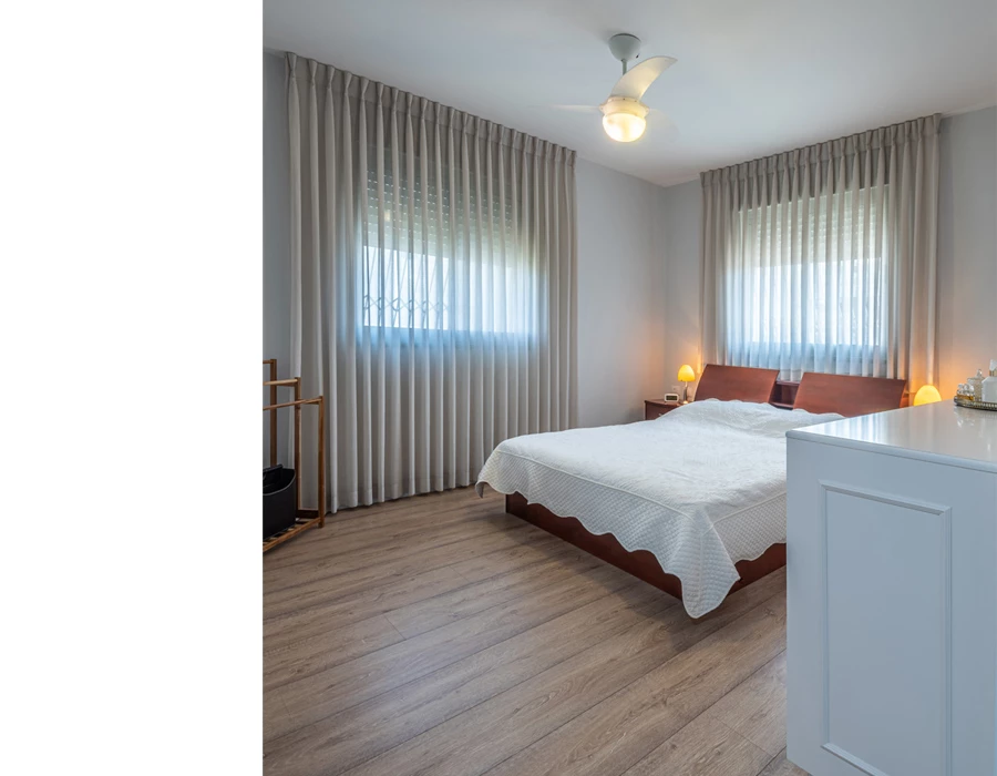 המעבר לחללים הפרטיים בבית מתחדד בזכות פרקט למינציה בגוון אלון, ששטיינר קיבלה מן המוכן ובחרה לא לשנות. גם הריהוט בחדר השינה הועבר מן הבית הקודם, וכדי לעדן אותו הוסיפה וילונות מבד נופל ותכננה שידה בקו עכשווי, המשלבת מגירות בעומקים שונים ותא עם פתיחה עליונה לניצול מיטבי של חלל החדר. "אני רואה חשיבות רבה בפרקטיות ובניצול מיטבי של השטח למחיה ולאחסון", היא מדגישה.