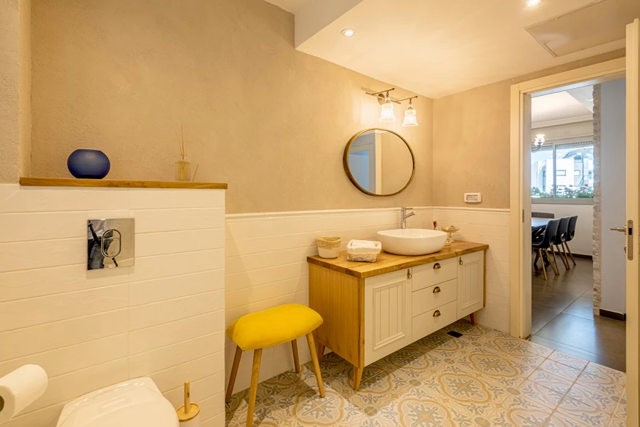 בעוד שחדר האמבט הצמוד לחדר ההורים לא שונה, המקלחת ושירותי האורחים זכו לרענון משמעותי באמצעות שינוי מיקום הכיור והאמבטיה, ביטול המקלחון והחלפת חלון האלומיניום. שילוב של אריחים מצוירים ועץ בוצ'ר בארון הכיור ובמדף שנוצר מעל מכל ההדחה הסמוי ועל אדן החלון, מוסיפים לתחושה הנעימה השוררת בחלל.