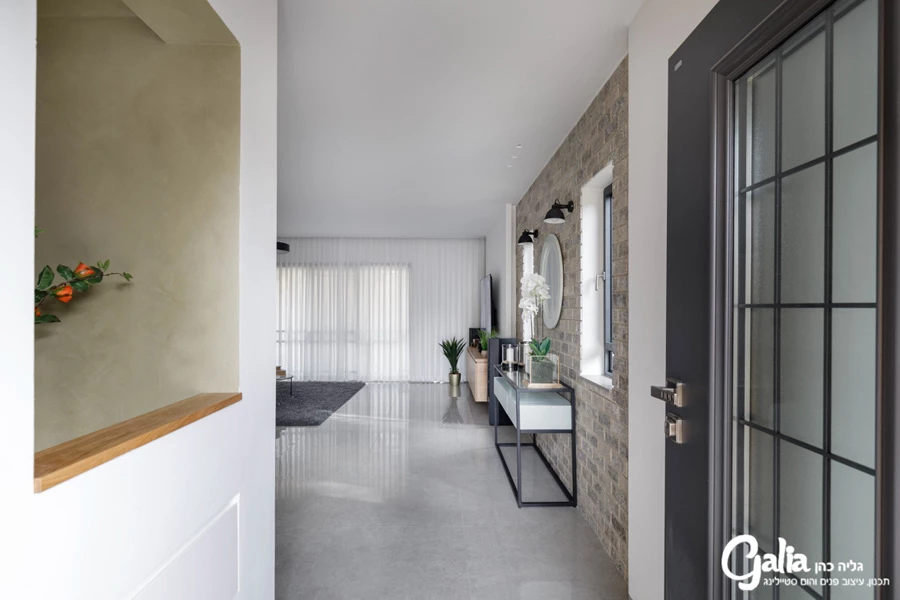 כבר כאן, בכניסה, אפשר לראות את המחשבה הרבה שהושקעה בכל פרט. עם פתיחת הדלת מתגלה בפני הבאים מבנה לא שגרתי, שעומקו כ-80 ס"מ ובמרכזו פתח, דרכו נשקף המטבח. דפנותיו הפנימיות של ה"חלון" צבועות בגוון ירקרק, גוון שגליה מרבה להשתמש בו כדי להכניס את הטבע הביתה. הדופן התחתונה מחופה עץ ומהדופן העליונה של הפתח משתלשל גוף תאורה. חלקו התחתון של המבנה המסיבי הוא יחידת מגירות כפולה - האחת מצד המבואה והשנייה מצד המטבח.