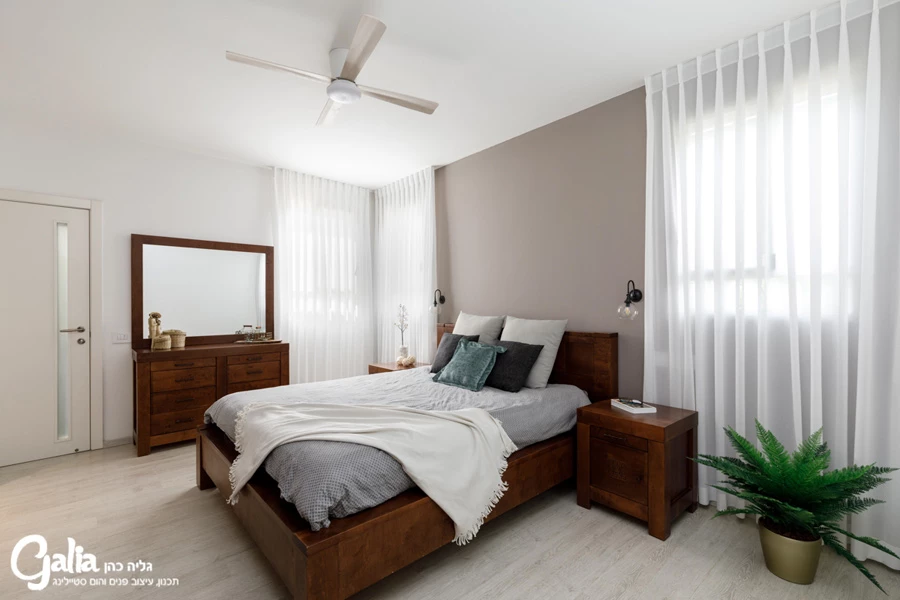 חדר השינה של ההורים, לעומת זאת, עוצב בסגנון סולידי. באמצעות כלים בסיסיים כמו רהיטי עץ כהים וקיר בגון מוקה, וילונות שקופים למחצה וגופי תאורה עדינים, מתקבל גם בו אפקט דרמטי ומלא עניין.