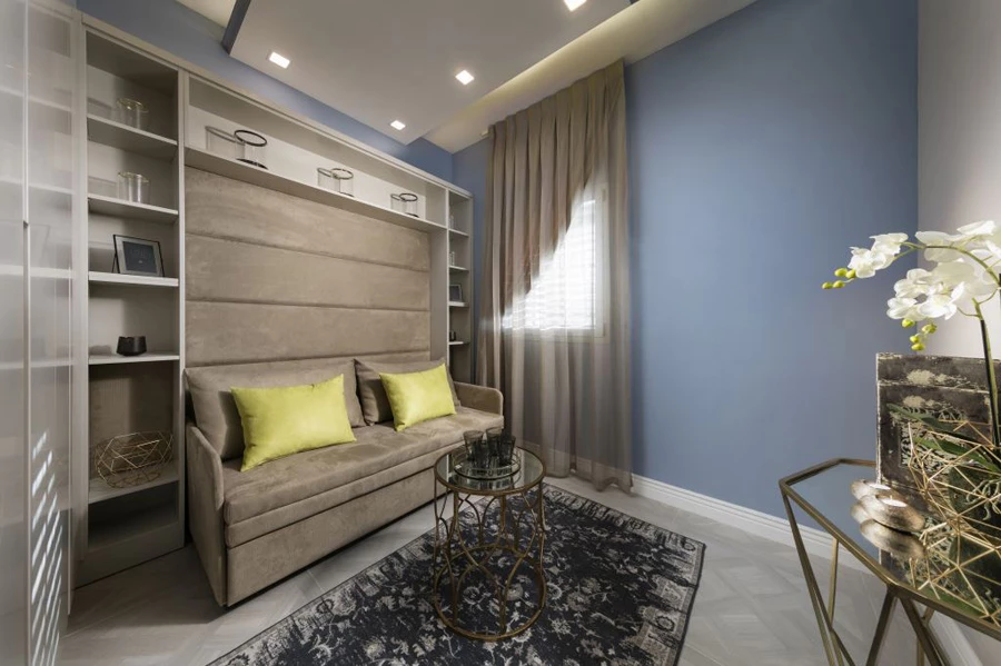 לחדר השינה נבחר הצבע הצהוב, שיוצר חמימות רומנטית. גב מיטה קטיפתי ייחודי ואלגנטי עם מוטיבים עגולים בחיתוך לייזר , שחוזרים על עצמם באמצעות מראות שהוצבו לאורך הארונות הממוקמים במקביל למיטה. כורסא בעלת ריפוד קטיפתי צהוב נבחרה, לצד שידת איפור שגם היא בגוון צהוב, משלימות את המראה העיצובי הרך והכה אלגנטי של החלל.