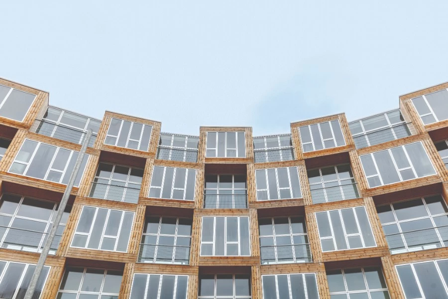 קורות עץ ארוכות מכסות את חזית הבניין מכל הצדדים ומדגישות את המבנה המיוחד. הקורות מתחלפות ביניהן במטרה להבליט את הדפוס המשובץ. החלונות הגדולים מאפשרים לאור היום להאיר את הדירות, ומעניקים נקודת תצפית רחבה אל החצר הירוקה ואל השכונה שמקיפה את הבניין. גודל הדירות נע בין 60 ל-115 מ"ר.