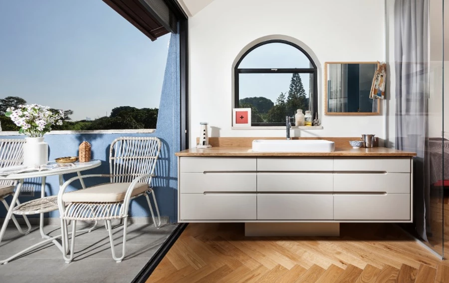 קומות המגורים תוכננו כך שיהוו מקום מפלט איכותי. כך למשל סוויטת ההורים הנפרשת על פני מפלס שלם שם תכננה המעצבת חדר שינה מרווח וחדר רחצה מפנק המורכב כולו מקירות זכוכית. החלל הייחודי ורחב הידיים פונה לגג הבית כך מתאפשרת פרטיות, זאת ועוד יצרה וינברן גדר במבוק המשלבת בתוכה צמחיה חיה. האמבטיה עצמה פונה לחדר השינה של בני הזוג, אף הוא עשוי זכוכית, ובזמן שהם שוכבים במיטה נגלית מבעד לוויטרינה המרפסת המרשימה ואור טבעי חודר פנימה ברכות. המראה המתקבל ללא ספק מעורר השראה ונדמה כאילו נלקח ממלון בוטיק ביעד אקזוטי במיוחד.