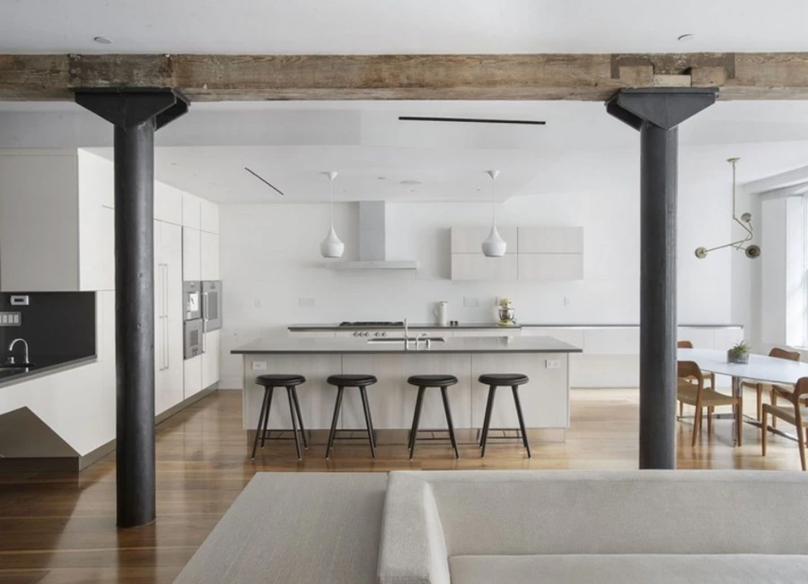 פניני העיצוב הפזורות בדירה כוללות, בין השאר, ארונות צפים מעץ אגוז באזורי המגורים וחדרי השינה, ובר רטוב, המשולב בקיר המטבח הרב-תכליתי. עמודי תמיכה מעוגלים במראה תעשייתי, הנמתחים מהרצפה עד לקורות העץ בתקרה, מגדירים את החללים הפונקציונליים ומוסיפים למראה המסוגנן של החלל.