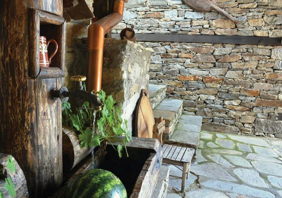 החצר הכפרית מבטאת היטב את העיסוקים של בעליה: סככות גפן לצל עם אשכולות ענבים כבדים (הבולגרים הם אוהבי יין ידועים), מרתף לשימורים, מקום מגודר לגידול לתרנגולות וכבשים (גבינה בולגרית, איך לא?), ופינה לאחסון גזרי עץ המשמשים להסקת הבית בחורף המושלג.